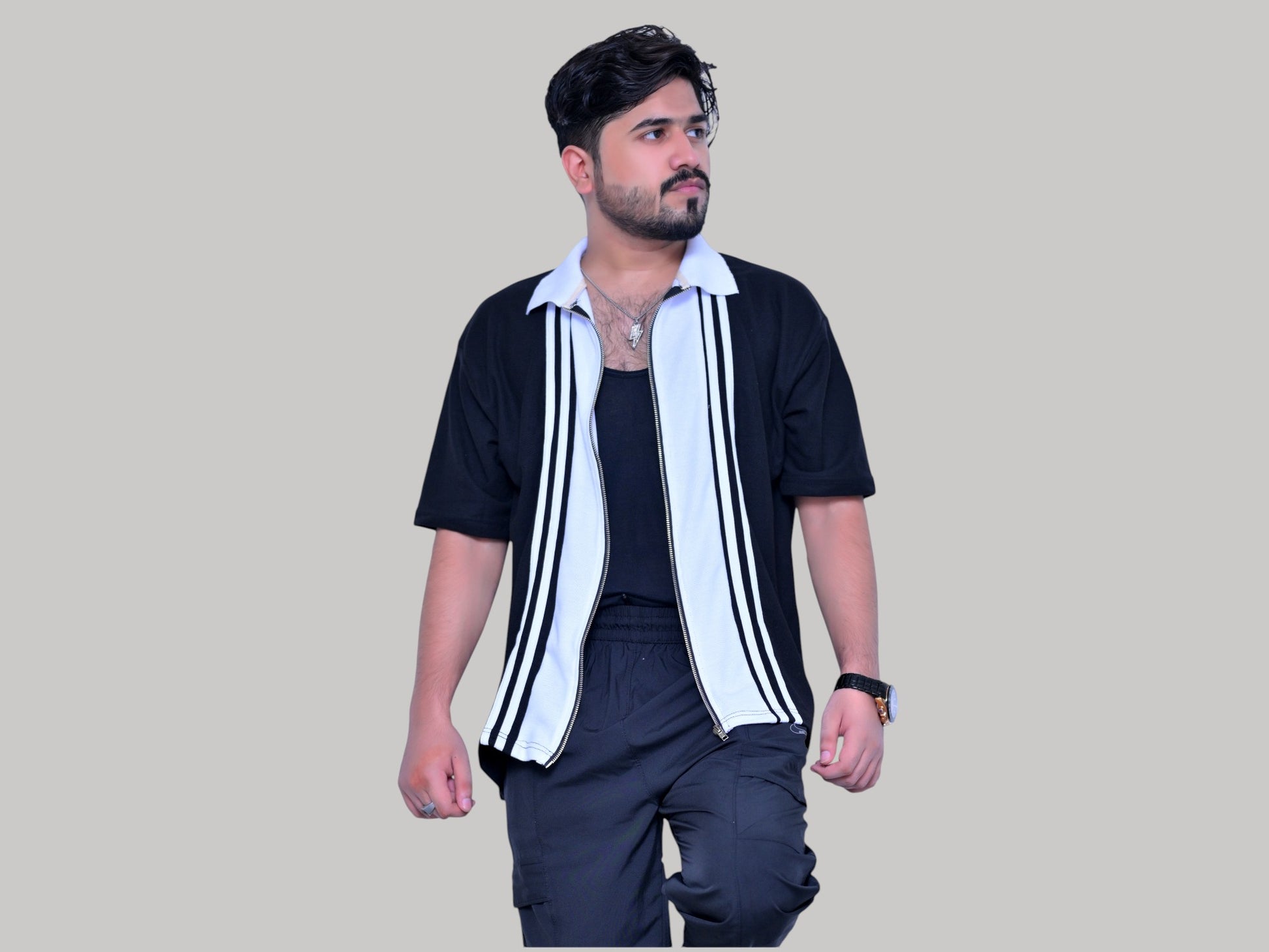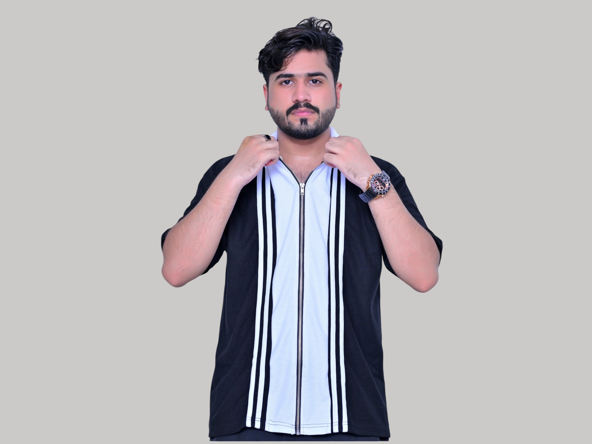 WHITE STRIP BLACK POLO WITH FULL ZIP